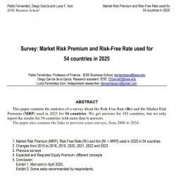 This paper by Pablo Fernandez, Diego Garcia de la Garza and Lucía F. Acín contains the statistics of a survey about the Risk-Free Rate (RF) and the Market Risk Premium (MRP) used in 2025 for 54 countries.