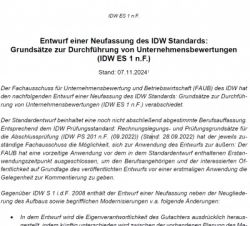 Mit Datum vom 07.11.2024 wurde der Entwurf der Neufassung des IDW Standards: Grundsätze zur Durchführung von Unternehmensbewertungen veröffentlicht.